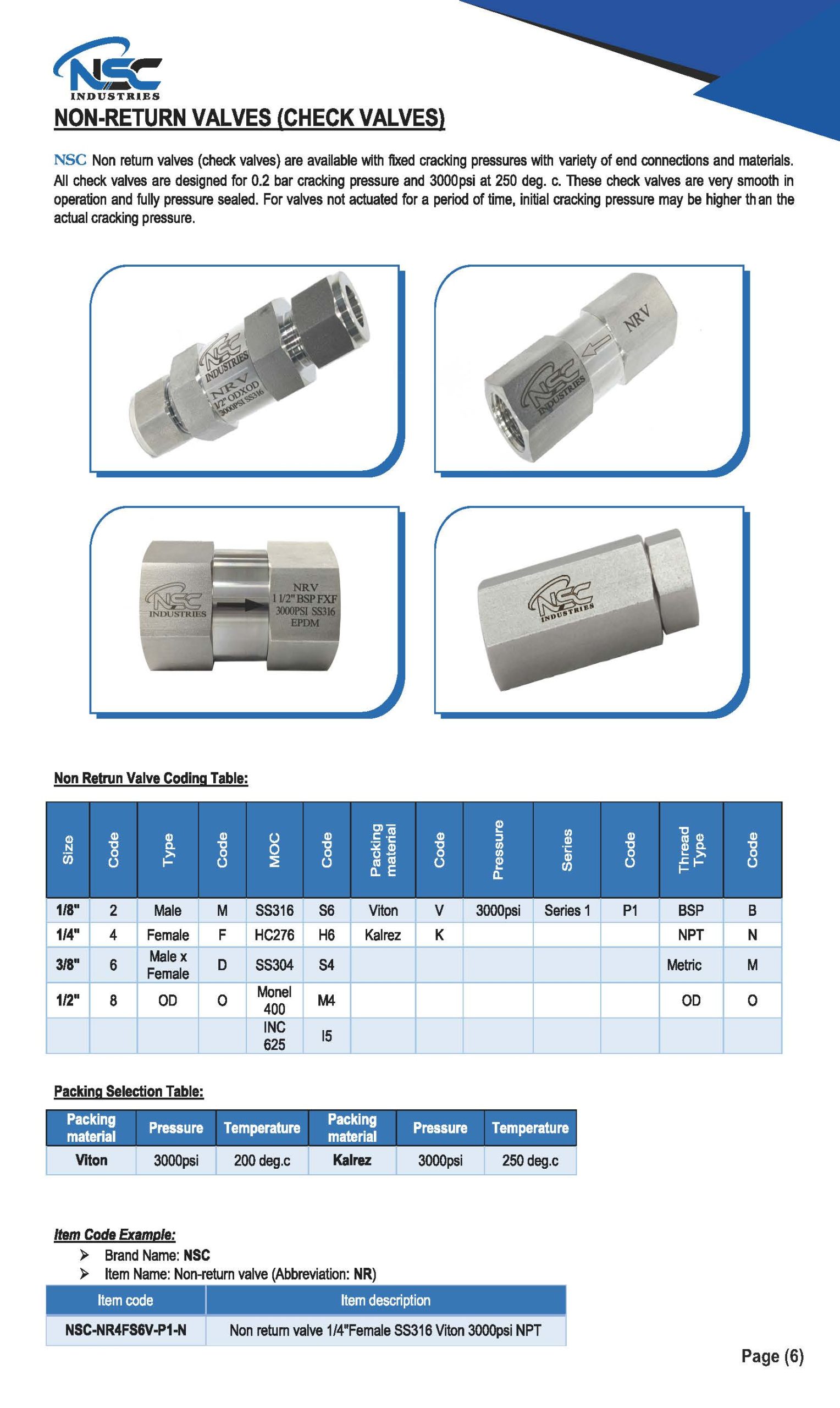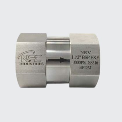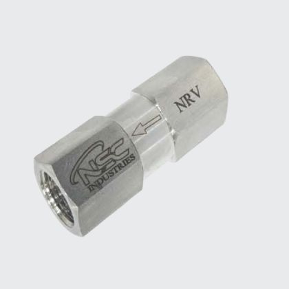 NSC Non return valves (check valves) are available with fixed cracking pressures with variety of end connections and materials. All check valves are designed for 0.2 bar cracking pressure and 3000psi at 250 deg. c. These check valves are very smooth in operation and fully pressure sealed. For valves not actuated for a period of time, initial cracking pressure may be higher than the actual cracking pressure.